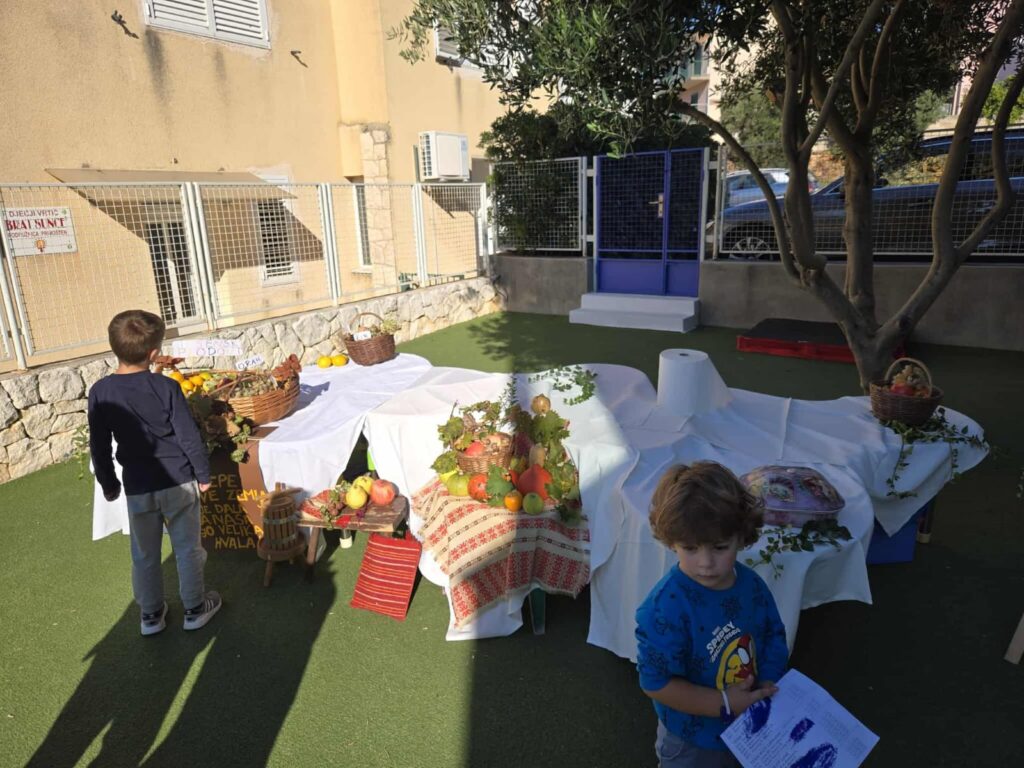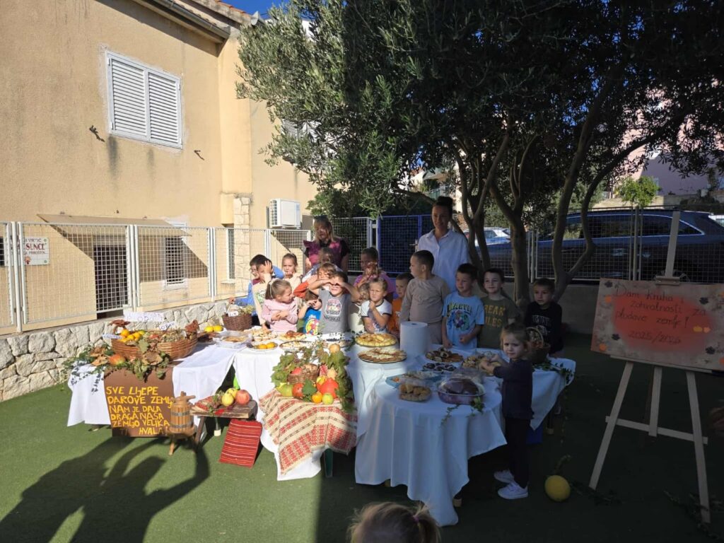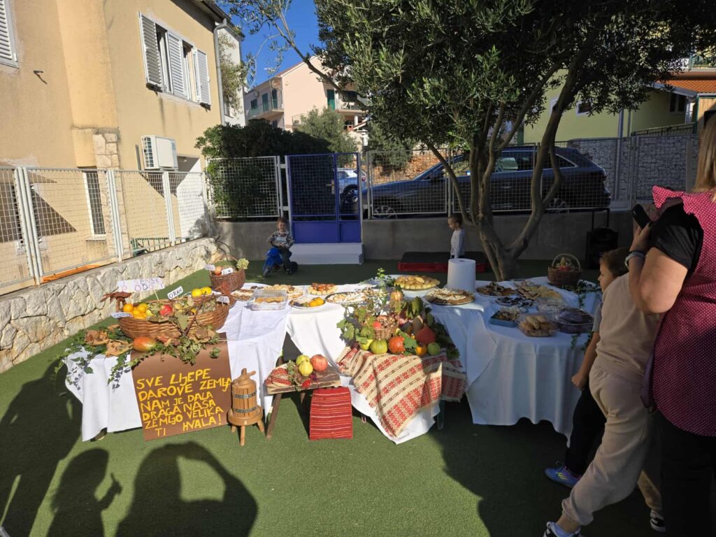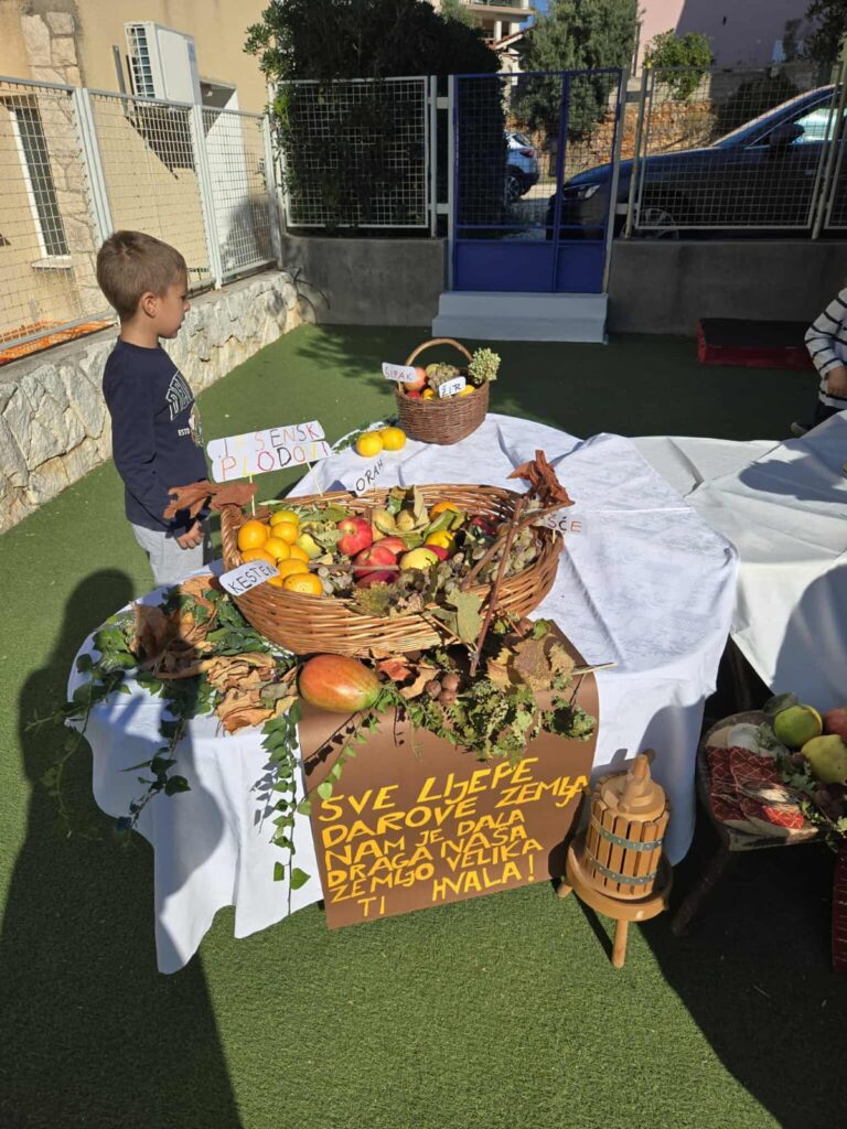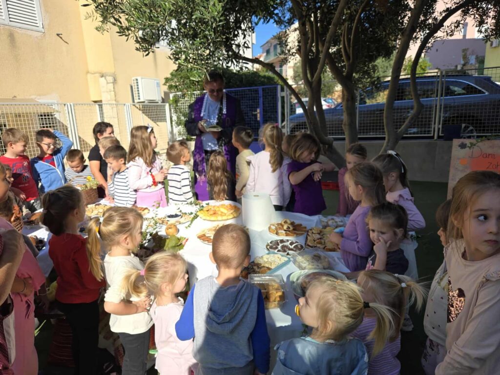 Djeca su s roditeljima izradili razna peciva, kolače, ubrali plodove voća i povrća iz svog vrta koje su odgojiteljice izložile na stolove, a velečasni Jurica Petković je blagoslovio sve plodove koji su bili pripremljeni. Iza blagoslova smo svi skupa degustirali izložene delicije.